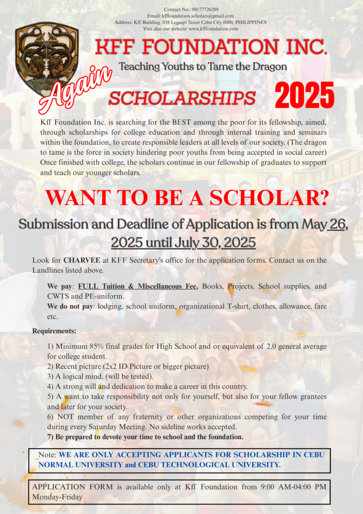 𝙂𝙊𝙊𝘿 𝙉𝙀𝙒𝙎! Are you ready to take the first step toward a brighter future? KFF Foundation Inc. is once again offering FULL scholarships (tuition, books, projects, and more!) to the best among the poor who are ready to lead and serve. For students entering 𝘾𝙚𝙗𝙪 𝙉𝙤𝙧𝙢𝙖𝙡 𝙐𝙣𝙞𝙫𝙚𝙧𝙨𝙞𝙩𝙮 or 𝘾𝙚𝙗𝙪 𝙏𝙚𝙘𝙝𝙣𝙤𝙡𝙤𝙜𝙞𝙘𝙖𝙡 𝙐𝙣𝙞𝙫𝙚𝙧𝙨𝙞𝙩𝙮.